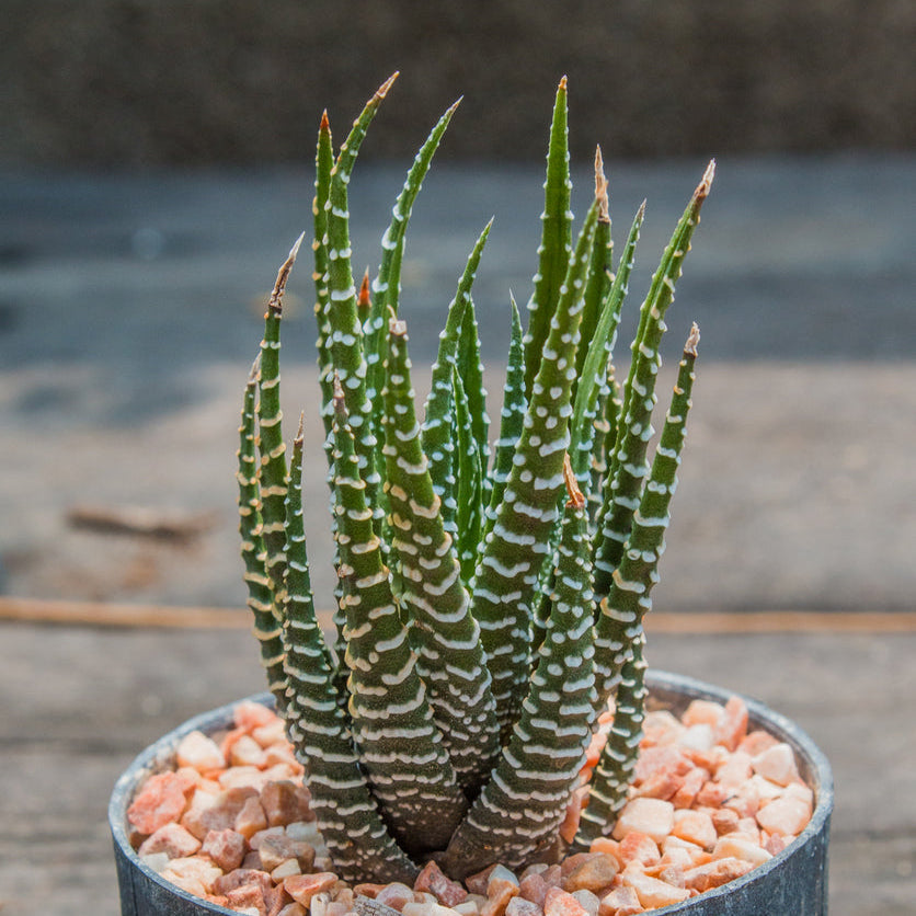 HAWORTHIA 'Big Band'. 18-24" tall, bright indirect light. Bold green foliage with wide zebra-striping and purple undersides. Ideal houseplant for adding texture and contrast. Zones 10-12. Potted in 3" pot.