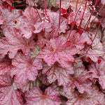 HEUCHERA 'Berry Smoothie' PP21871 COPF. 18" tall, 20" spread, part-full shade, early summer bloom. Evergreen. Attractive rose-pink foliage opens with a glossy sheen and subtle veining and turns to a bronze-red by the end of summer. Pink and white flowers hang high over this "berry-tastic" plant. Warning: May cause cravings for fruit smoothies! Attracts butterflies, hummingbirds & is bee friendly! Deer resistant. Zones 4-9. Potted in 3" pot.