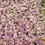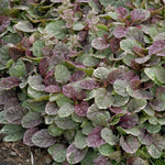 AJUGA r. 'Burgundy Glow'. 6" tall, 8-10" spread, full sun-full shade, mid-late spring bloom. Fantastic tri-colored foliage in shades of creamy-white, rose-burgundy, and dark green make this ajuga different than all the others. In the fall, the mature leaves turn a deep bronze while the newer growth takes on a rose tone. Short spikes of blue flowers stand upright above the low, spreading foliage. The effect is stunning when planted in mass. Zones 3-10. Potted in 3" pot.
