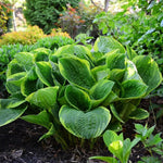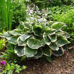 Tall. 20-23" tall, 36-45" spread, part-full shade, lavender flowers. Dark green leaves have a thin, yellow margin that fades to creamy white in the summer. Occasionally the margin will streak to the center of the leaf. Forms an attractive mound of rounded leaves that are cupped and heavily corrugated. Exhibits greater slug resistance. Attracts hummingbirds. Zones 3-9. Potted in 3" pot.