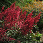 ASTILBE x. a. 'Fanal'. 20" tall, 18-20" spread, part sun-full shade, early summer bloom. Bright red plumes are presented on upright spires. One of the earliest red Astilbe to bloom. Foliage is mahogany red in spring, turning green by summer. Bee friendly. Deer & rabbit resistant. Zones 4-9. 2-3 eye, bareroot division.