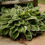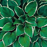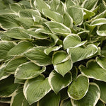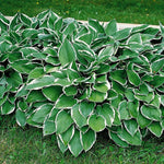 HOSTA. Medium. 14" tall, 36" spread, lavender flowers, part-full shade. Glossy green, heart-shaped leaves with narrow, clean white margins. Exhibits greater sun tolerance. Attracts hummingbirds. Zones 3-9. #1 grade bareroot, wrapped in high grade potting soil.