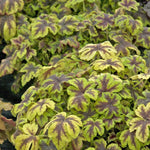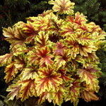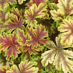 HEUCHERELLA 'Gold Zebra' PP22104 COPF. 8" tall, 15" spread, part sun-full shade, late spring-midsummer bloom. Bright yellow, feathery leaves are boldly marked with dark-red. 18" tall wands of white flowers tower over the bold foliage. A standout in containers or front and center of the border. Attracts butterflies and hummingbirds. Zones 4-9. Potted in 3" pot.