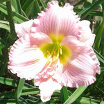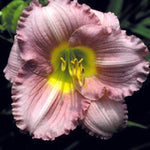 (Apps) 36" EM D F 4 ¼" bloom. Soft pink with lavender veining and shading. Diamond dusted pink rib runs to green heart with creped and ruffled edges that are rounded and turn back gently. Full Sun. Attracts butterflies and is bee friendly. Zones 3-9. 2/3 fan division, bareroot.