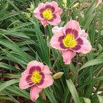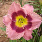 (Blaney) T 26" EM D Re 5" bloom. Mauve pink flowers with a prominent wine purple eye, yellow-green throat and ruffled edges. Consistently rounded blossoms with more durable petals and sunfast color. Vigorous grower and rapid multiplier. Full Sun. Attracts butterflies and is bee friendly. Zones 3-9. 2/3 fan division, bareroot.