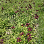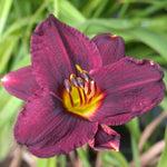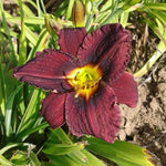 (Fay) 24" M D 2 ¾" bloom. Dark plum-purple self with a yellow-green throat. Very near black in color. Because of the intense color we suggest that it be grown in semi shade. Full Sun. Attracts butterflies and is bee friendly. Zones 3-9. 2/3 fan division, bareroot.