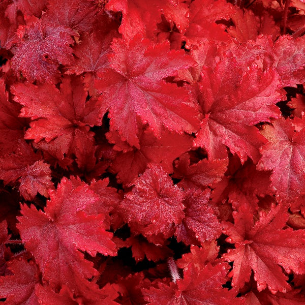 HEUCHERA 'Fire Chief' PP21880. 9" tall, 15" spread, part-full shade, early summer-early fall bloom. Evergreen. Wine-red foliage matures with maroon markings, adding spectacular color to the front of the border. Dark red stems produce sprays of small white and pink bell-shaped flowers above mounds of foliage. Can tolerate more sun in cooler climates. Attracts butterflies, hummingbirds & is bee friendly! Deer resistant. Zones 4-9. Potted in 3" pot.