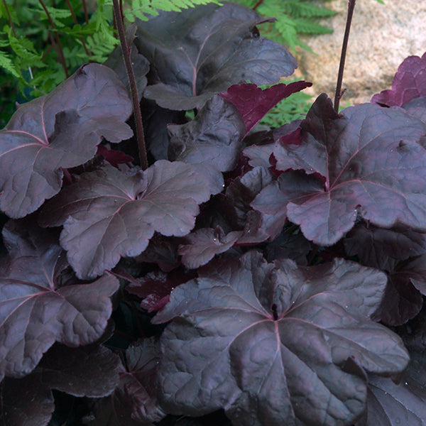 HEUCHERA x. hybrida 'Obsidian' PP14836. 10" tall, 16" spread, part-full shade, late spring-early summer bloom. Evergreen. Stunning, shiny purple-black satin leaves are broad and rounded. Small, bell-shaped creamy-white blooms rise to 24" above the semi-evergreen foliage. Attracts butterflies, hummingbirds & is bee friendly. Deer resistant. Zone 4-9. Potted in 3" pot.