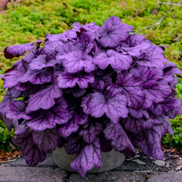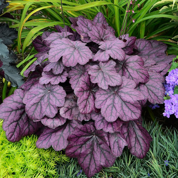 HEUCHERA 'Wild Rose' PP29923 CPBR5990 - PRIMO® Series. 8-10" tall, 18-20" spread, part-full shade, midsummer bloom. Evergreen. Large, bright rosy-purple leaves with deep charcoal gray veining. Upright, dark burgundy rose flower scapes have matching dark buds that open to rosy-pink flowers. Looks great when paired with 'Black Pearl'. Attracts butterflies, hummingbirds & is bee friendly! Deer resistant. Zones 4-9. Potted in 3" pot.