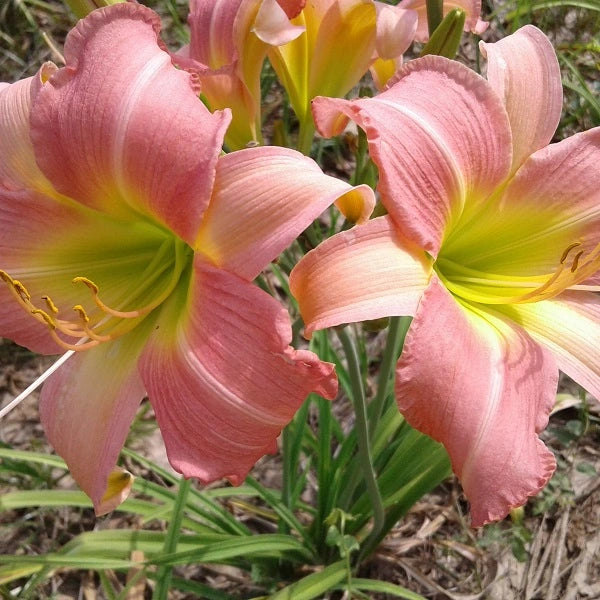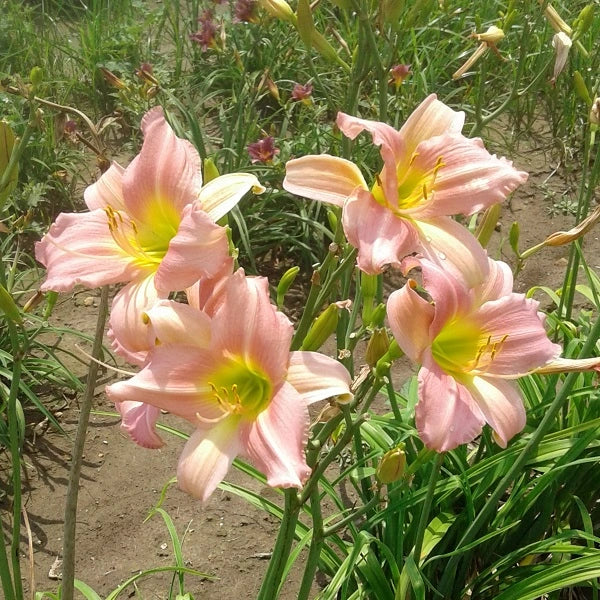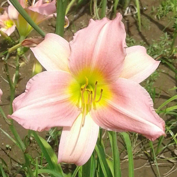 (Hardy) 28" M D 5" bloom. Pale baby pink self with paler rib and a smaller lemon-yellow throat. Flowers form a six-point star! Blooms well in the sun and part shade. Full Sun. Attracts butterflies and is bee friendly. Zones 3-9. 2/3 fan division, bareroot.