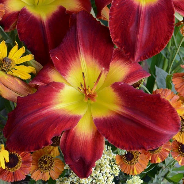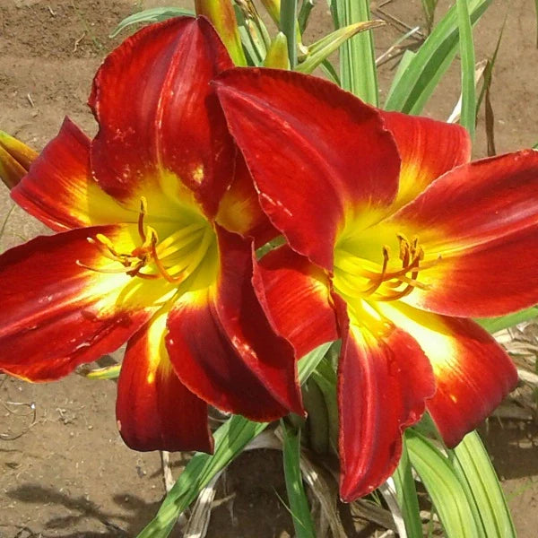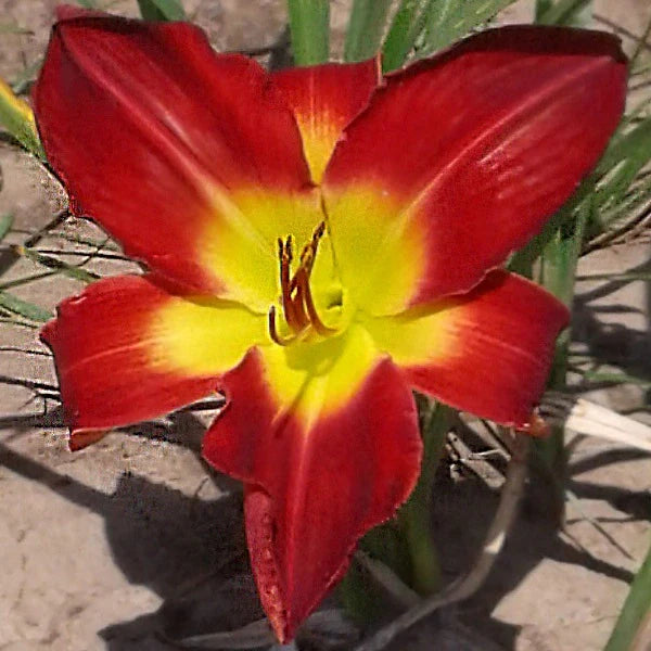 (Santa Lucia) T 32" ML D 6" bloom. If you're looking for the WOW factor in daylilies, look no further! This daylily boasts huge flowers with a broad triangular form. A true cherry red with a prominent, yellow throat that radiates out onto softly recurved petals. Strong, branched scapes carry very large buds. Full Sun. Attracts butterflies and is bee friendly. Zones 3-9. 2/3 fan division, bareroot.