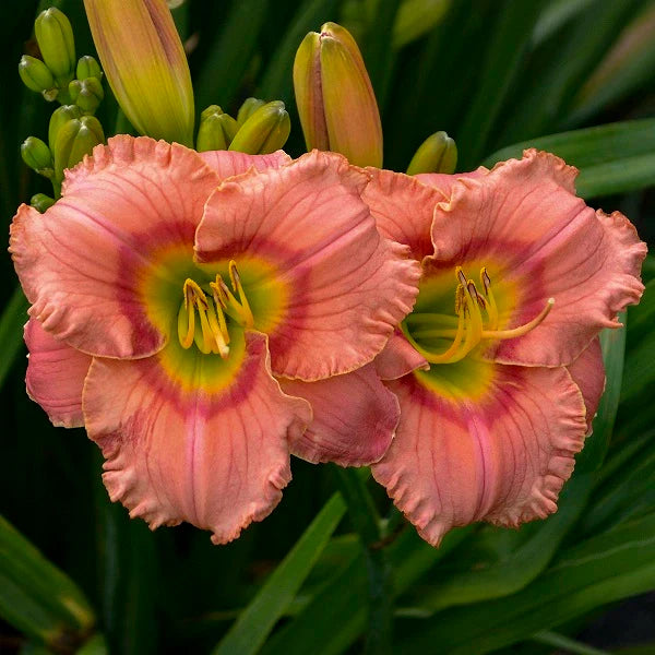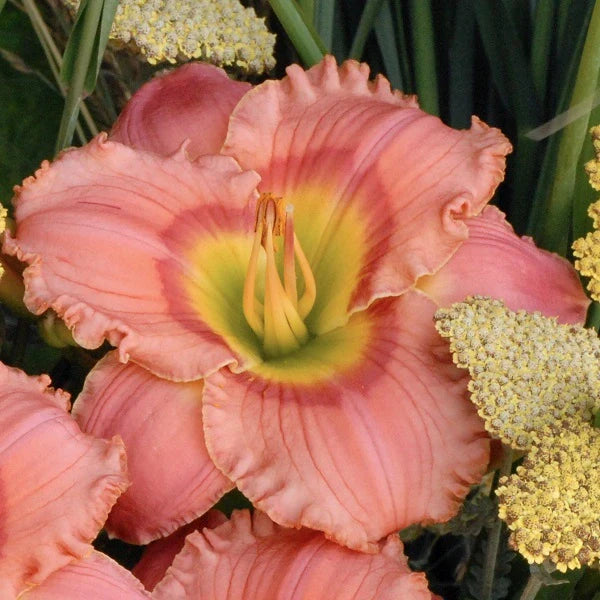 (Stamile) T 25" EM D Re VF 4¼" bloom. Medium pink flowers have a triangular red eye and a green throat. Blossoms are round in form and heavily ruffled. Color is sunfast. Excellent substance, scapes are well branched and budded. One of the best! Full Sun. Attracts butterflies and is bee friendly. Zones 3-9. 2/3 fan division, bareroot.