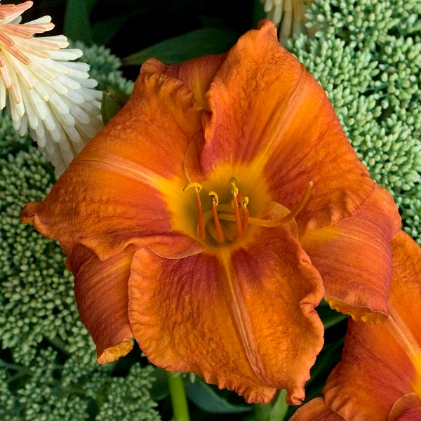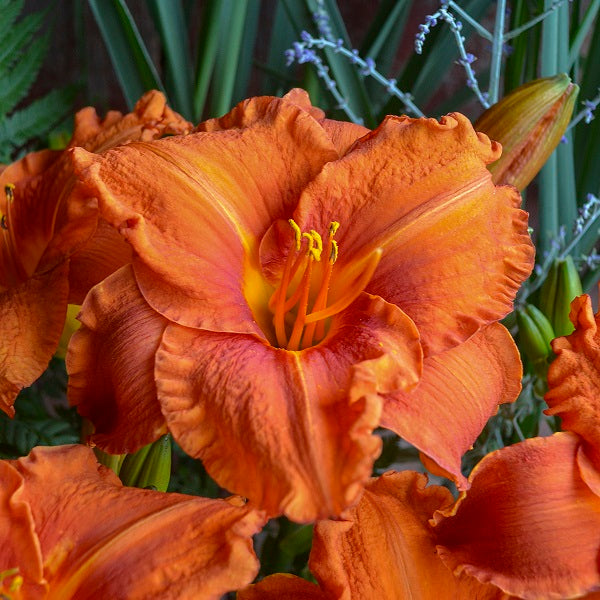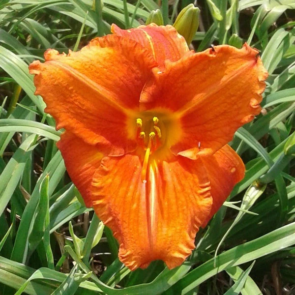 (Benz) T 30" M D OE 5 ½" bloom. A profusion of brilliant orange flowers with heavily ruffled petals and a slightly darker orange halo set the garden ablaze! Yellow-orange throat, heavily budded. Full Sun. Attracts butterflies and is bee friendly. Zones 3-9. 2/3 fan division, bareroot.