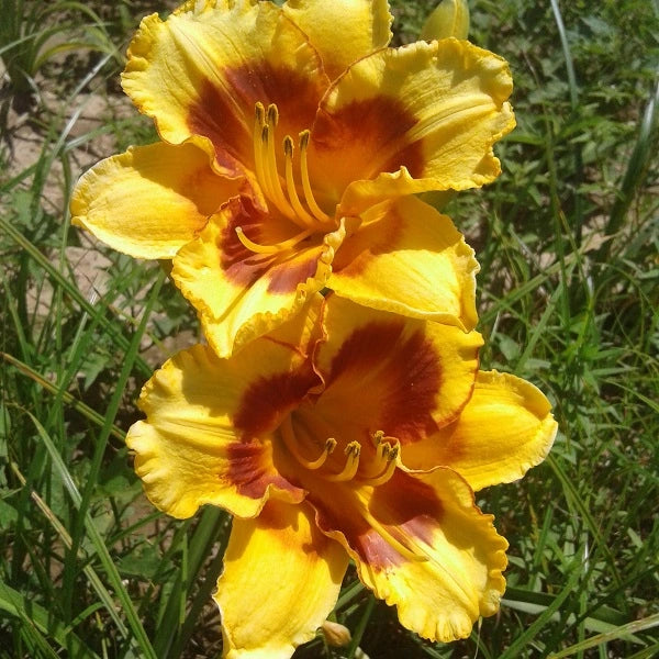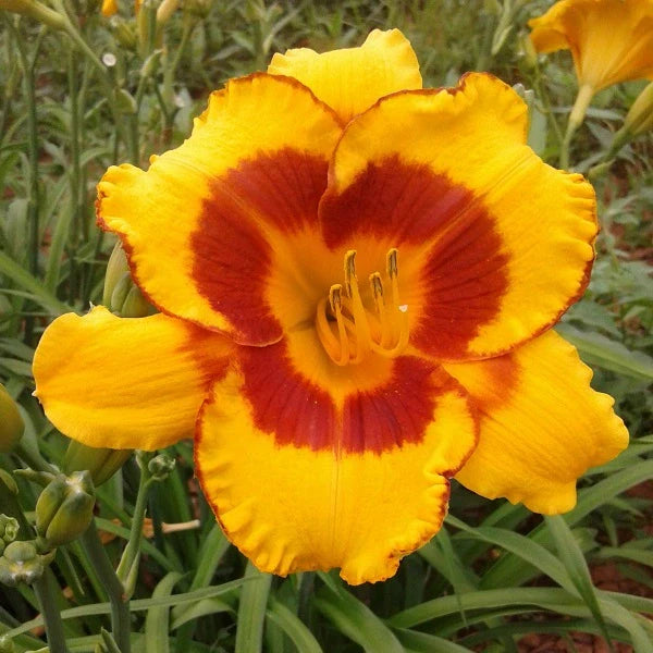 (Reilly-Hein) T 24" EM D Ext 5 ½" bloom. These large flowers are a radiant golden yellow with a striking deep red eye and matching picotee edge. Broad, rounded petals have beautiful pie crust edging. Performs consistently well in all regions. Full Sun. Attracts butterflies and is bee friendly. Zones 3-9. 2/3 fan division, bareroot.