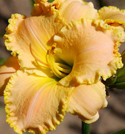 (Klehm) T 34" M D F 6" bloom. Light peach blended with golden peach ruffles. Petals are wide with cream midrib. Will make a graceful addition to your garden. Full Sun. Attracts butterflies and is bee friendly. Zones 3-9. 2/3 fan division, bareroot.