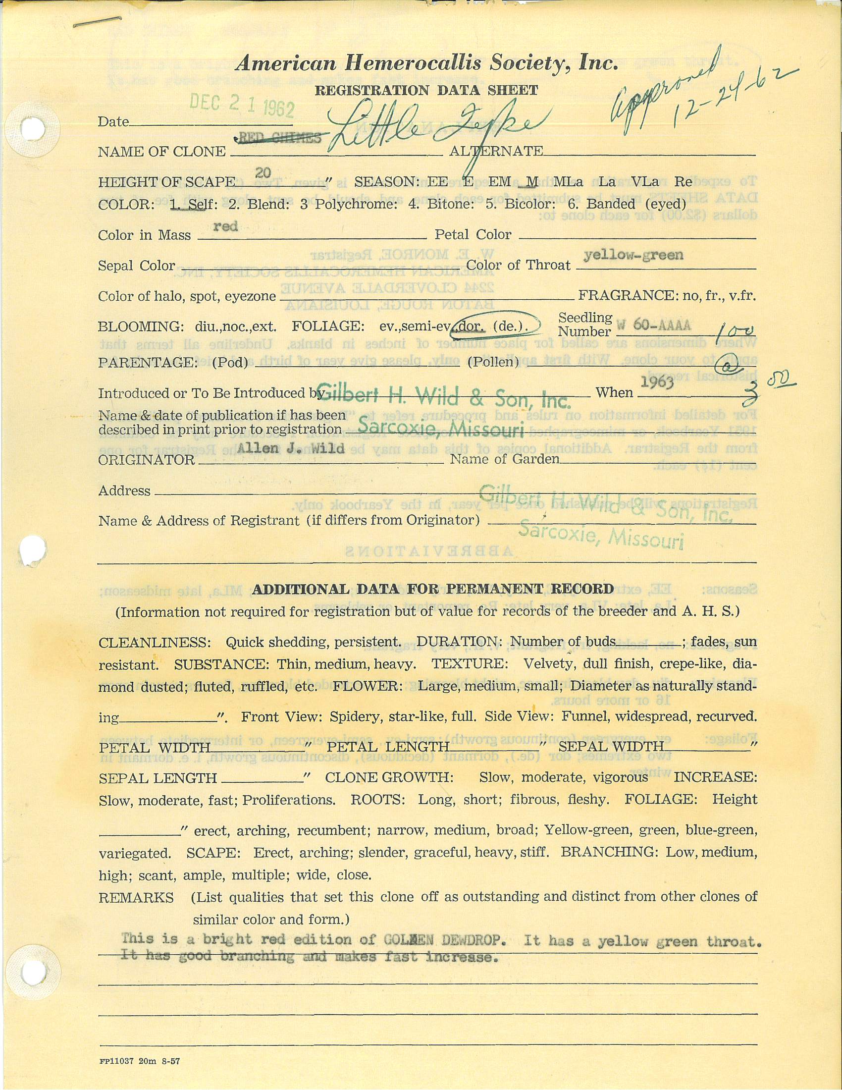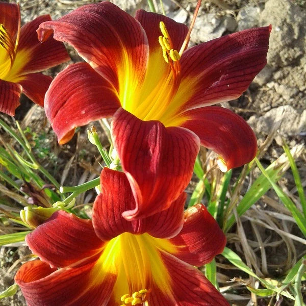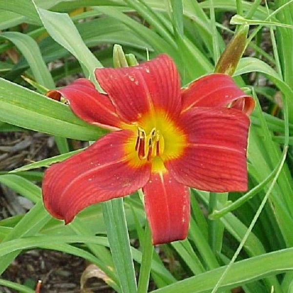 (Wild) 20" M D 3 ½" bloom. Bright red with a yellow green throat. Slightly overlapping ruffled petals. Good branching makes fast increase. A good miniature for the front of your garden. Full Sun. Attracts butterflies and is bee friendly. Zones 3-9. 2/3 fan division, bareroot.