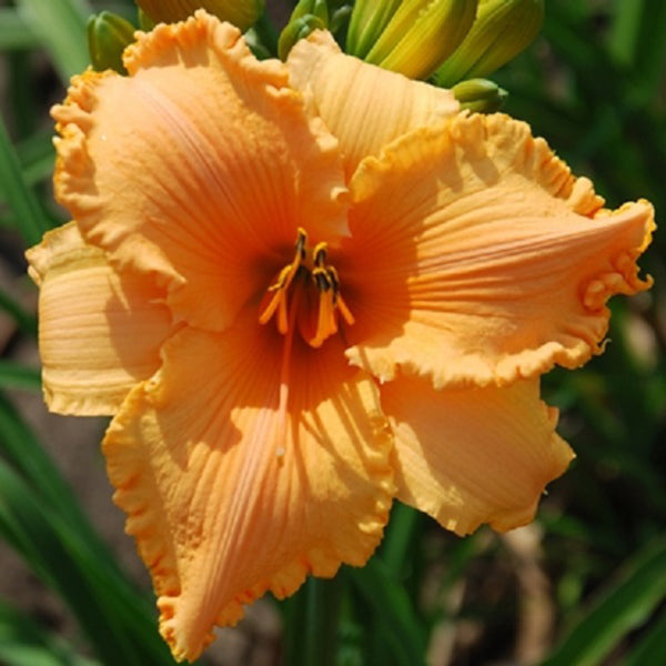 (Klehm) T 36" M D 6" bloom. Nectarine self with deeper nectarine ribbing. Ruffled edges also have deeper coloration. Vigorous grower. Full Sun. Attracts butterflies and is bee friendly. Zones 3-9. 2/3 fan division, bareroot.