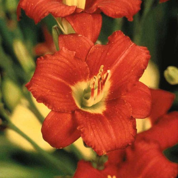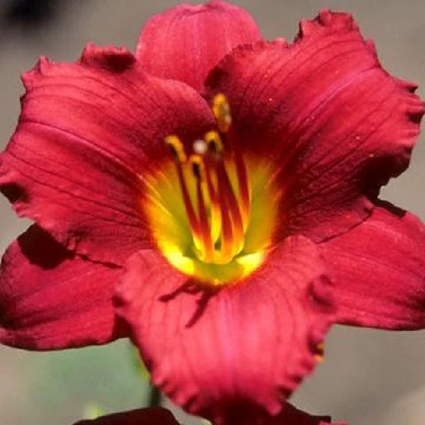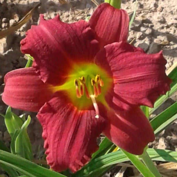 (Apps) 18" M D Re F OE 2 ¾" bloom. Bright cranberry red self with a narrow yellow watermark and bright green throat. Petals have pie crust ruffled edges, sepals are smooth, and both are slightly recurved. Great garden combination planted with Happy Returns for a full season of bloom! Full Sun. Attracts butterflies and is bee friendly. Zones 3-9. 2/3 fan division, bareroot.