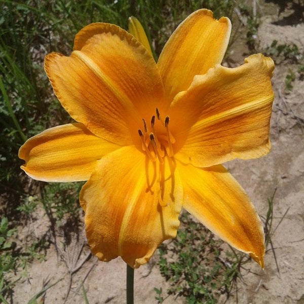 (Hardy) T 36" EM D Ext 6" bloom. Big and beautiful, bittersweet orange with a burnt orange eyezone. Throat and midribs are a lighter orange yellow. Petals have crimped edges, sepals are smooth, both are recurved. Award winner! Bareroot & wrapped in high quality gardening mix. Zones 3-9.