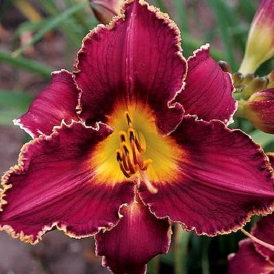 (Klehm) T 30" M D 6" bloom. Gorgeous, rich purple blossoms are thickly textured and nicely complemented with a creamy white ruffled edge. Sunfast blooms. A must have for your garden! Full Sun. Attracts butterflies and is bee friendly. Zones 3-9. 2/3 fan division, bareroot.