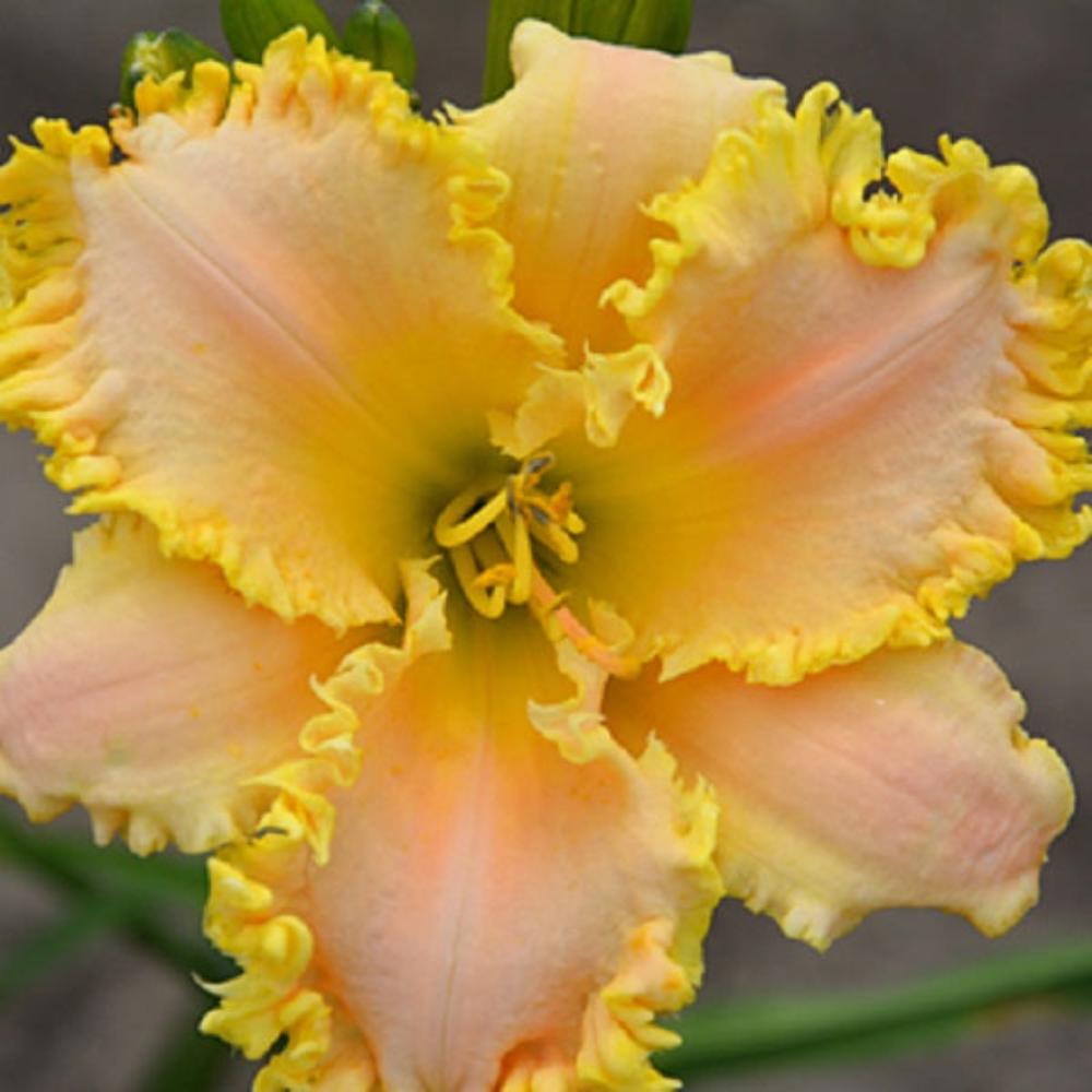 (Klehm) T 32" E D 6" bloom. A sassy yellow peach blend above a green throat and a bright gold, toothy edging. Full Sun. Attracts butterflies and is bee friendly. Zones 3-9. 2/3 fan division, bareroot.