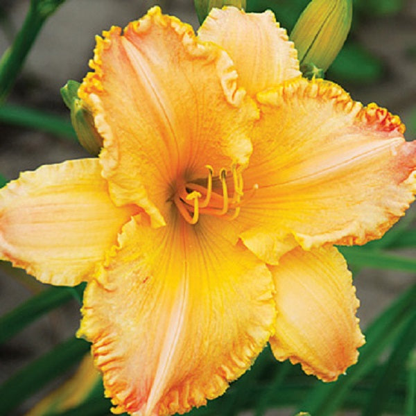 (Klehm) T 32" M D 6" bloom. Beautiful nectarine self with orange and yellow hues, cream midrib. Ruffled, fine gold wire edging with orange-red shadowing between the folds at the tips of each petal. A garden masterpiece. Full Sun. Attracts butterflies and is bee friendly. Zones 3-9. 2/3 fan division, bareroot.