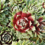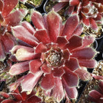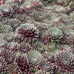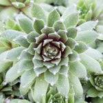 SEMPERVIVUM t. 'Jade Rose'. 4" tall, 6" spread, full sun. Fuzzy-tipped, jade-green outer petals surround burgundy centers. Forms large, tight, overlapping rosettes. Larger rosettes can reach up to 5" across, producing smaller rosettes to form a handsome colony. Drought and heat tolerant. Deer and rabbit resistant. Zones 3-9. Potted in 3" pot.