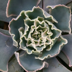 ECHEVERIA shaviana. 6-8" tall, 6-10" spread full sun-part shade, summer bloom. A charming rosette-forming succulent recognized for its ruffled, spoon-shaped leaves with soft blue to silvery-lavender tones and delicate pink edges, especially in bright light. Prefers well-draining soil with infrequent watering, allowing the soil to dry completely between waterings. In summer, up arching flower stalks bear small, bell-shaped pink flowers with yellow interiors. Zones 9-11, it is sensitive to frost and should be protected or brought indoors in colder climates. Its attractive foliage and easy care make it ideal for container gardens, rock gardens, or sunny windowsills.