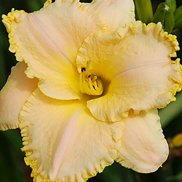 (Klehm) T 34" ML D 5 ½” bloom. A darling soft pastel cream self with deep golden ruffled edges. Full Sun. Attracts butterflies and is bee friendly. Zones 3-9. 2/3 fan division, bareroot.
