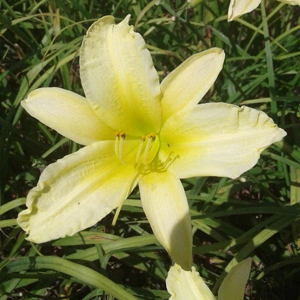 (Kraus) 36" M D F Ext 7" bloom. Large flowering delicate yellow with darker yellow veining. Wide segments creped and ruffled. Full Sun. Attracts butterflies and is bee friendly. Zones 3-9. 2/3 fan division, bareroot.