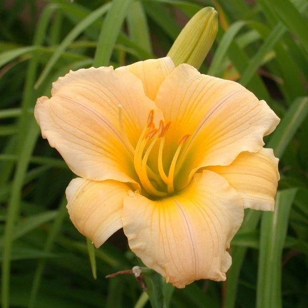 (Wild) 29" E D F Ext 5 ¾" bloom. Light peach with raised cream midribs and a yellow green throat. No need to baby" this plant, it is a vigorous grower. Full Sun. Attracts butterflies and is bee friendly. Zones 3-9. 2/3 fan division, bareroot.