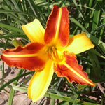 (Fay) 24" ML D 5 ½" bloom. Bright bicolor of orange, yellow, red and tan trumpet shaped flowers. A very fast grower and excellent for mass planting. Full Sun. Attracts butterflies and is bee friendly. Zones 3-9. 2/3 fan division, bareroot.