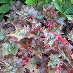 HEUCHERA m. 'Palace Purple'. 8-12" tall, 12-16" spread, shade, late spring-midsummer bloom. Evergreen. Large, shiny, star-shaped leaves, ranging from olive green to purplish-bronze. Undersides are a striking metallic amethyst purple. Attracts butterflies, hummingbirds & is bee friendly. Deer resistant. Zones 4-9. Potted in 3" pot.