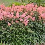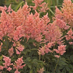 ASTILBE j. 'Peach Blossom'. 24" tall, 15-18" spread, part sun-full shade, early summer bloom. Delicate peach plumes are dense with a hint of pink. Plumes are full and lend a frothy appearance to the clump. Glossy, green foliage. Bee friendly. Deer & rabbit resistant. Zones 4-9. 2-3 eye, bareroot division.