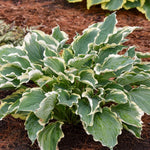 PP33266 CPBRAF. Tall. 22" tall, 24-32" spread, part-full shade, near white flowers. Heart-shaped, blue horizontal leaves have a crisp creamy white margin and form a formal habit. Its most notable feature is the incredible ruffling on the leaves that undulate all the way to the pointed tips. Rapid grower. Attracts hummingbirds. Zones 3-9. Bareroot & wrapped in high quality gardening mix.