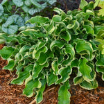 SHADOWLAND® Collection. PP23565 CPBR4948. Medium. 11-18" tall, 28-30" spread, light lavender flowers, part-full shade. Like a little girl's wavy locks, extremely ruffled leaves are wavy all the way from the crown out to the leaf tips. This ruffling is evident even on juvenile plants. Green leaves with cream margins are of good substance. Attracts hummingbirds. Zones 3-9. Bareroot & wrapped in high quality gardening mix.