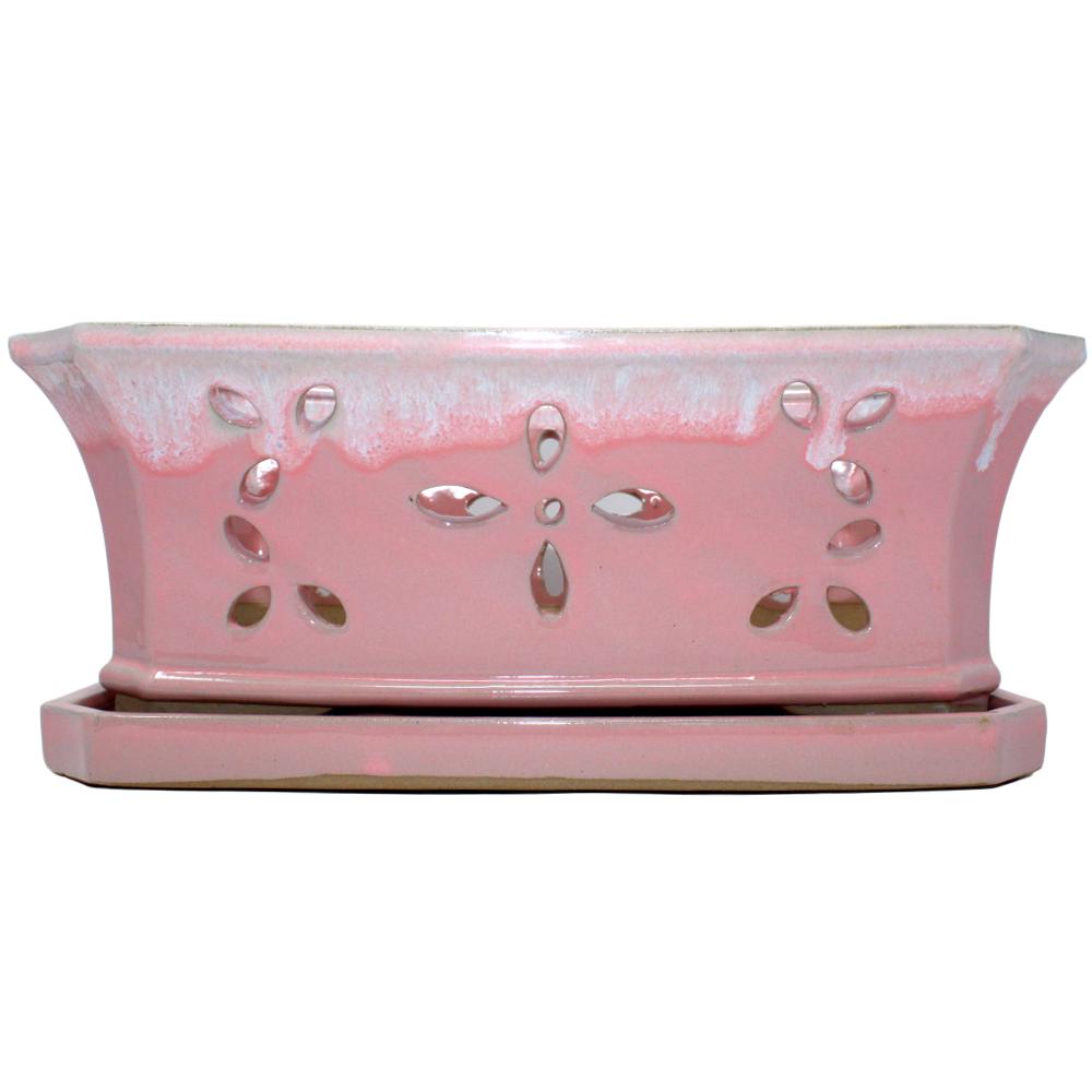 These all new 8" x 13" ceramic glazed orchid window box is perfect for holding two plants side by side. It comes with a fixed drip tray, multiple rubber pads on the base to protect surfaces, and stands just over 5" tall. Inside diameter is approximately 8" x 13" and outside diameter is about 8.5" x 13.5". A lovely floral cut out design pattern allows light and aeration for your plants.