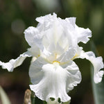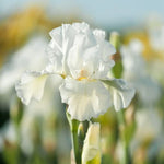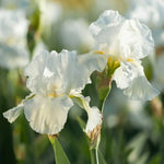Iris 'Frequent Flyer'. Tall Bearded. Early Spring bloom. 32" tall. Reblooming. Yellow beards contrast with the white petals. The unusually broad, gray-green leaves make this iris attractive even when it is not in bloom. Drought tolerant, highly resistant to deer and rabbits, very attractive to butterflies! Zones 3-10. #1 grade, bareroot rhizome.