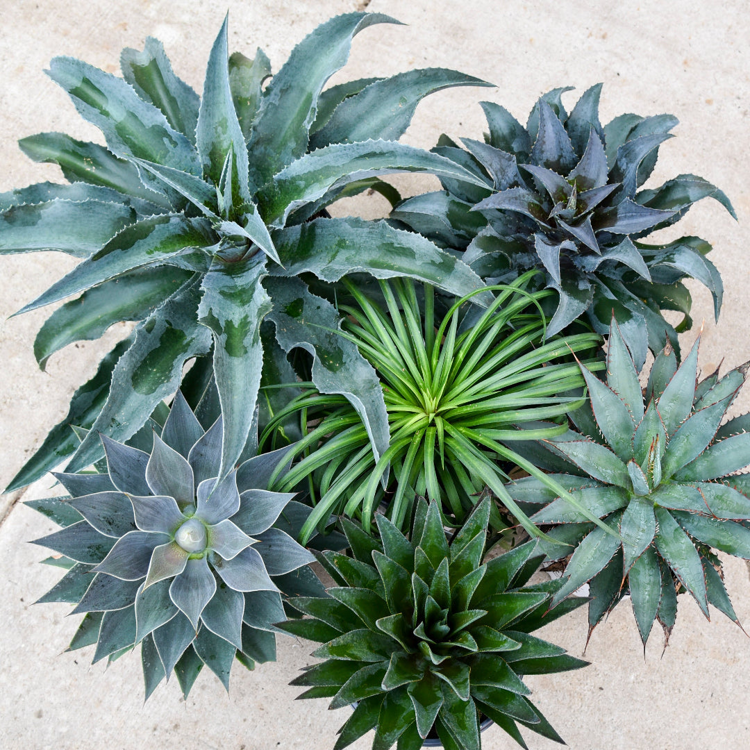 MANGAVE 'Art & Solections™ Mix. Proven Winners®. 6-10" tall with equal spread, full sun. Try something new! Slow growing tender perennial. A great mix of architectural forms and colors. Mangave varieties within mix: 'Bad Hair Day', 'Catch a Wave', 'Lavender Lady', 'Night Owl', 'Thunderbird' and 'Tooth Fairy'. Deer & rabbit resistant. Zone 7B-11. Potted in 3" pot. **Note-item pictured may not be the same as the item you receive, our choice of color and variety**