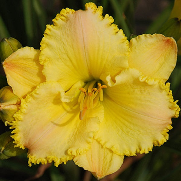 (Klehm) T 29" ML D 5" bloom. Cheery yellow self with midribs that start yellow at the green heart then fades to a soft pink then rosy-orange hues spill out at the tip. Extremely ruffled yellow edges with the occasional tooth. Full Sun. Attracts butterflies and is bee friendly. Zones 3-9. 2/3 fan division, bareroot.