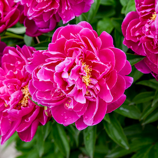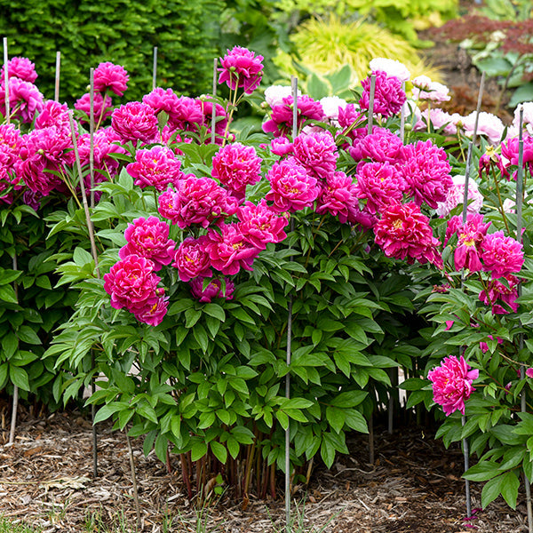 Peonies bloom best in well-drained soils in full sun but tolerant some shade as long as they have at least a half-day of sunshine. Good air circulation around the plant is important. Space 2-4 feet apart depending on desired effect. Never plant peonies back in the same location until you have removed soil that was around the original plant and replaced with new soil. We suggest that you work the soil 18 inches deep, into a good loose condition. Incorporate into the hole a mixture of good garden soil and compost. In zones 3-4, place eyes 2 inches deep. In zones 5-6, place eyes 1 inch deep. In zone 7, place eyes just below surface of soil. Work the soil around the roots as you cover the plant. Be sure to pack the soil well. Water well at the time of planting. During the spring months there is usually enough moisture in the ground, but if several weeks pass without rain, give them a good watering once every two weeks. This should also be done during the dry summer months after the peonies have bloomed, to insure a good crop of flowers the following year.