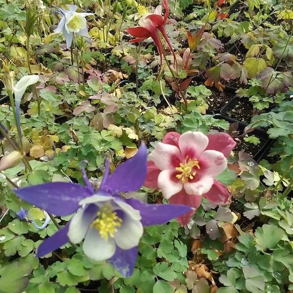 AQUILEGIA 'Kirigami Mixed' 14-24" tall, 12-20" spread, full-part sun, spring bloom. Improved sport of 'Origami'. Our choice of color variation - shades of blue, red and yellow. Up-facing blooms. Zones 5-9. Potted in 3" pot. **Note-item pictured may not be the same as the item you receive, our choice of color and variety**