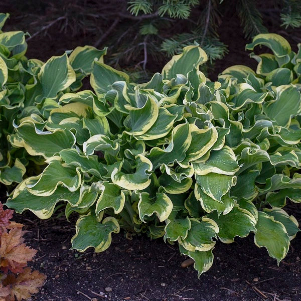 SHADOWLAND® Collection. PP23565 CPBR4948. Medium. 11-18" tall, 28-30" spread, light lavender flowers, part-full shade. Like a little girl's wavy locks, extremely ruffled leaves are wavy all the way from the crown out to the leaf tips. This ruffling is evident even on juvenile plants. Green leaves with cream margins are of good substance. Attracts hummingbirds. Zones 3-9. Bareroot & wrapped in high quality gardening mix.