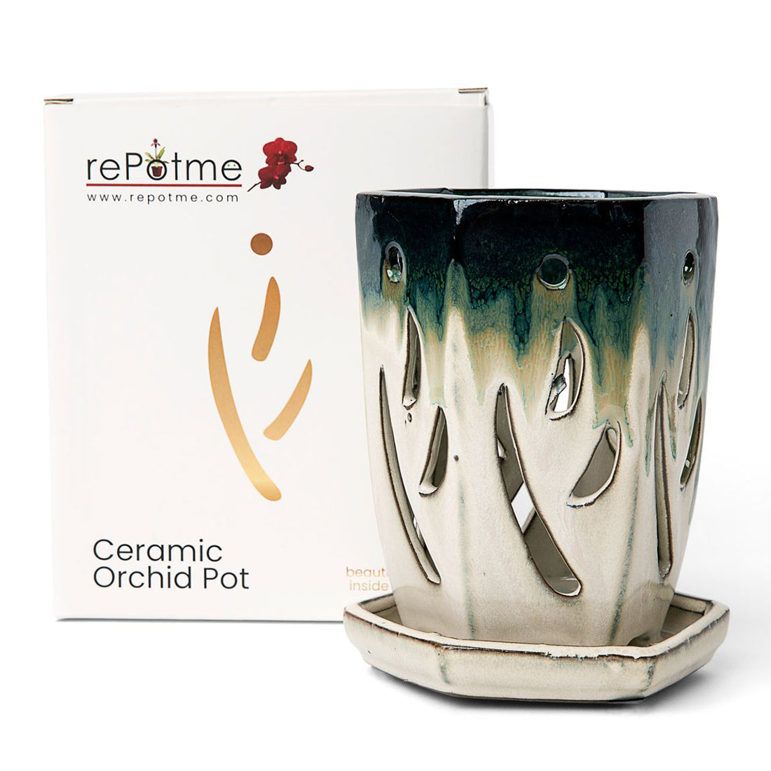The design provides for maximum aeration and light and includes feet that suspend the pot above the matching attached drip tray. Each ceramic orchid pot is unique and color varies from piece to piece, and will be a wonderful addition to your display.