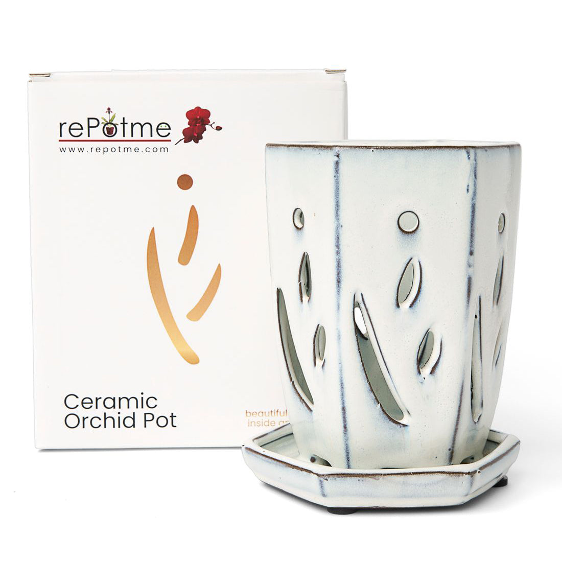 The design provides for maximum aeration and light and includes feet that suspend the pot above the matching attached drip tray. Each ceramic orchid pot is unique and color varies from piece to piece, and will be a wonderful addition to your display.