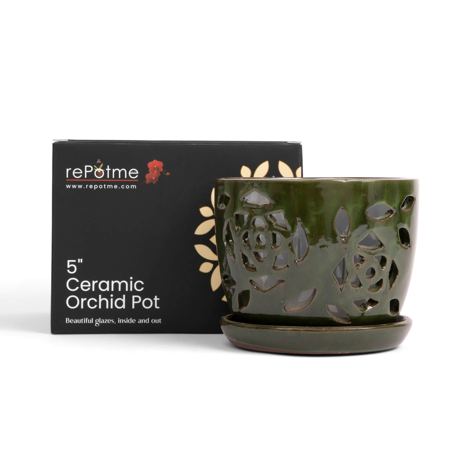 These roomy ceramic orchid pots are noted for their spectacular intricate floral design and beautiful glazes. One full side is done in the flower design and the other side is solid so they can be displayed either way. With great drainage into the attached drip tray and an open cut-out pattern, these pots will provide a perfect home for your prized plants.
