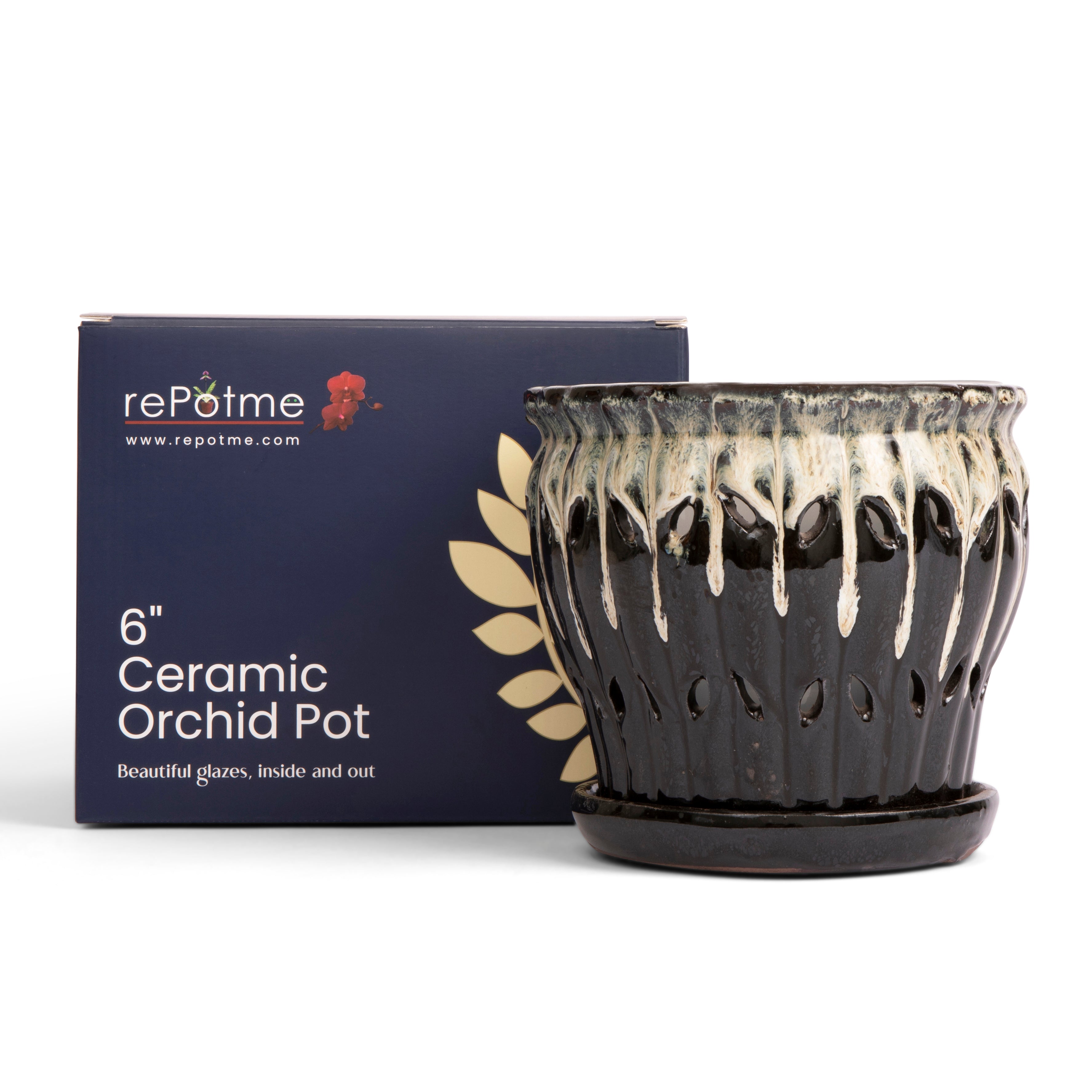 Our spectacular hand glazed ceramic orchid pots are available in five generous diameters, 6”, 7”, 8”, 9”, and 10”.  These are no ordinary ceramic orchid pots, as they are custom made for us and designed to fit with our free included clear plastic inserts.  The inserts help protect that incredible glazed finish while channeling water to the attached drip tray while still allowing light to reach roots for photosynthesis.  The included inserts keep roots from protruding through the side openings of the ceramic pot as well, and make it easy to lift the plant out to examine roots systems and moisture levels.  Each of these works of art are glazed inside and out and the base comes with soft pads attached to protect surfaces and furniture.  Stunningly beautiful, with a deep and rich glaze, these gorgeous pots will protect and show off your wonderful plants for many years to come.