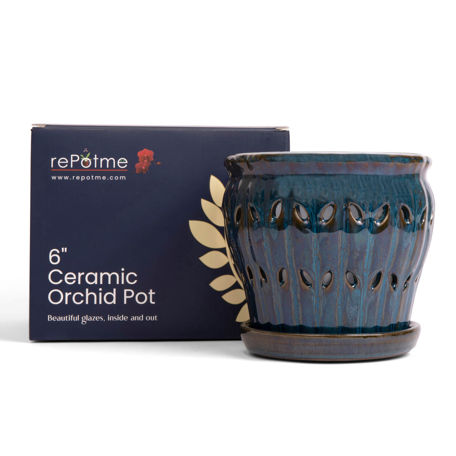 Our spectacular hand glazed ceramic orchid pots are available in three generous diameters, 6”, 8” and 10”.  These are no ordinary ceramic orchid pots, as they are custom made for us and designed to fit with our free included clear plastic inserts.  The inserts help protect that incredible glazed finish while channeling water to the attached drip tray while still allowing light to reach roots for photosynthesis.  The included inserts keep roots from protruding through the side openings of the ceramic pot as well, and make it easy to lift the plant out to examine roots systems and moisture levels.  Each of these works of art are glazed inside and out and the base comes with soft pads attached to protect surfaces and furniture.  Stunningly beautiful, with a deep and rich glaze, these gorgeous pots will protect and show off your wonderful plants for many years to come.