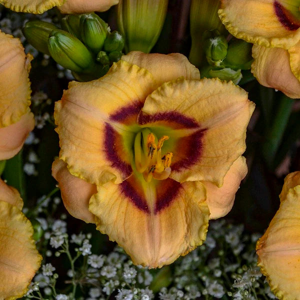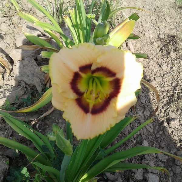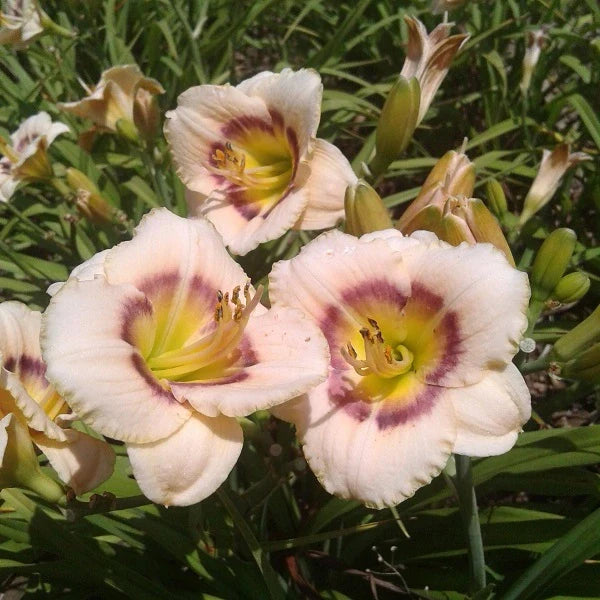 (Trimmer) T 22" EM D Re F 3" bloom. Creamy butter yellow, diamond dusted flowers with a narrow plum eye above a green throat. Perfectly rounded and ruffled form. Full Sun. Attracts butterflies and is bee friendly. Zones 3-9. 2/3 fan division, bareroot.