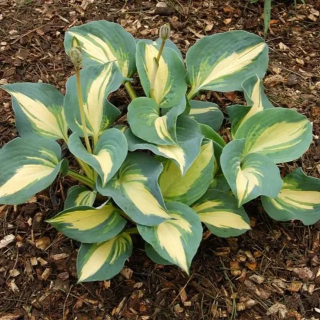 Tall. 18" tall, 24" spread, part-full shade, white flowers. Broad, heart-shaped leaves are bluish green with a narrow, creamy white center. Leaves are slightly cupped and corrugated with some waviness to the margin. Slow to reach maturity, but well worth the wait! Attracts hummingbirds. Zones 3-9. Bareroot & wrapped in high quality gardening mix.